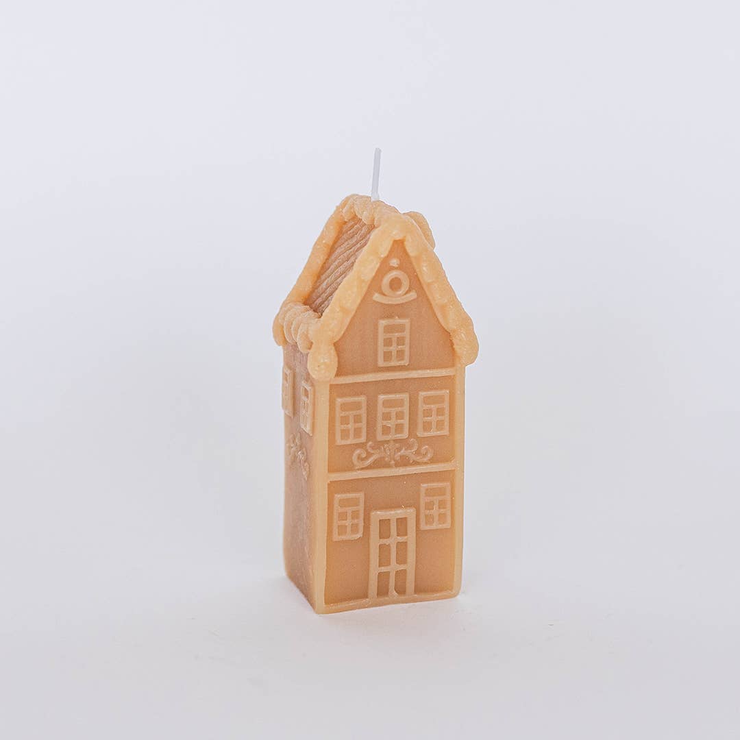 Cozy gingerbread house candle with snowy roof details. - brown colour