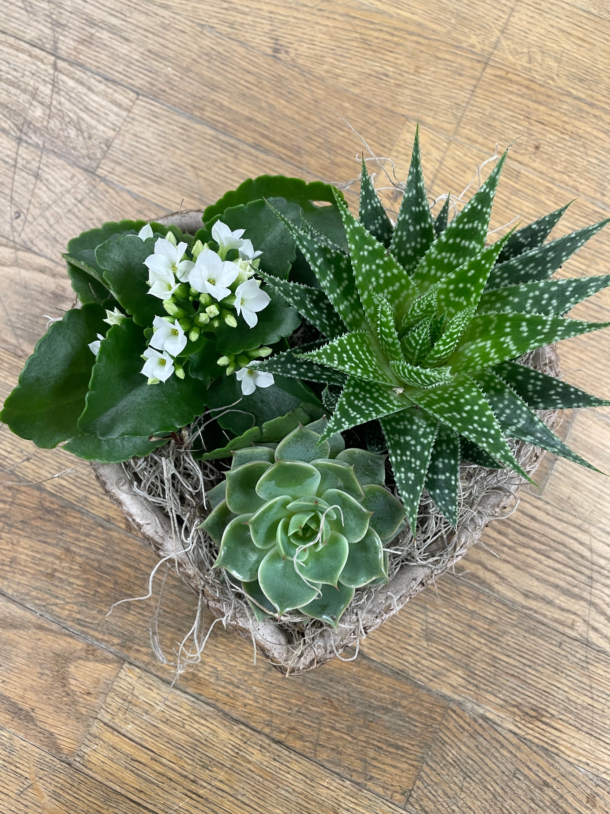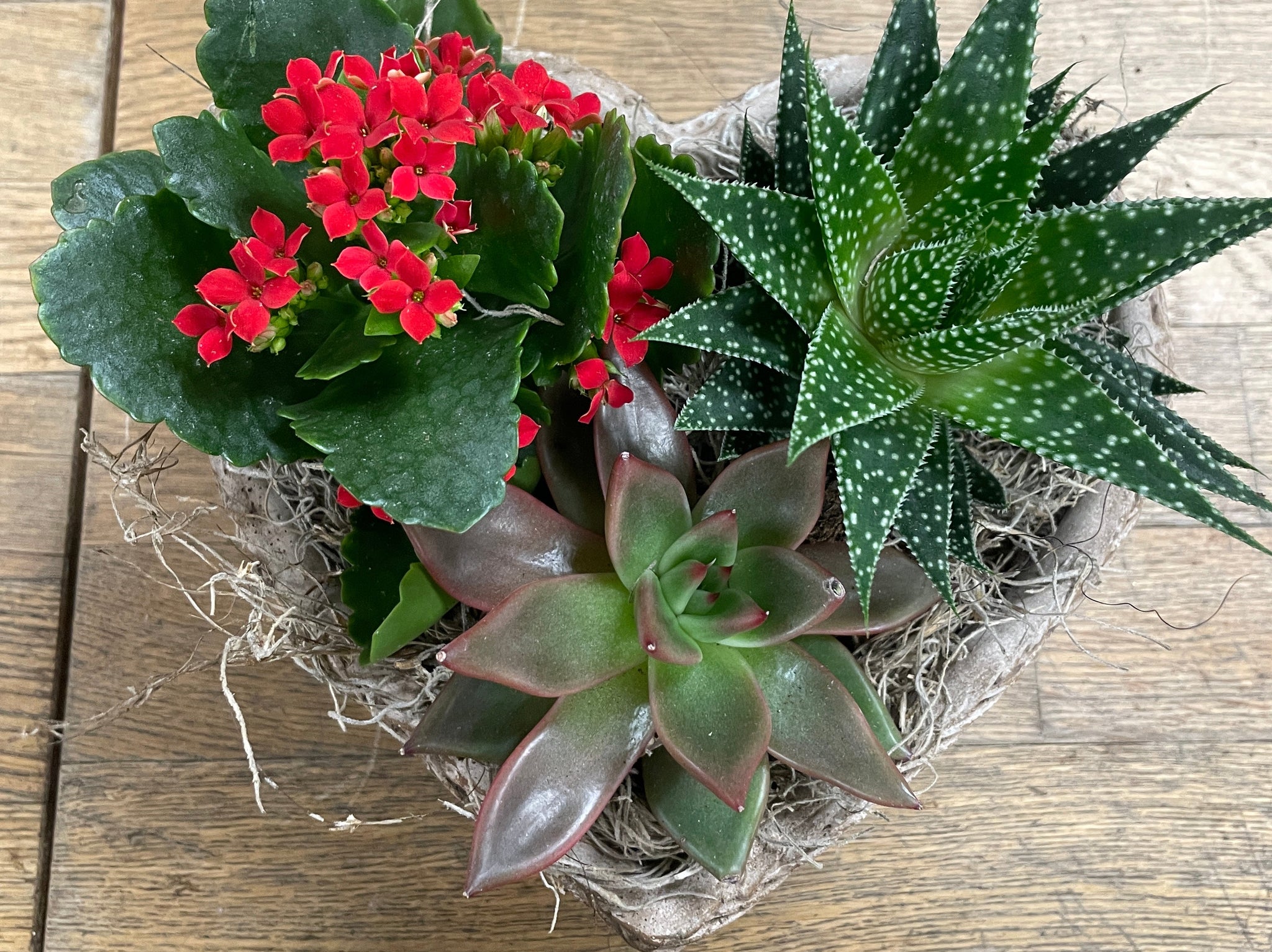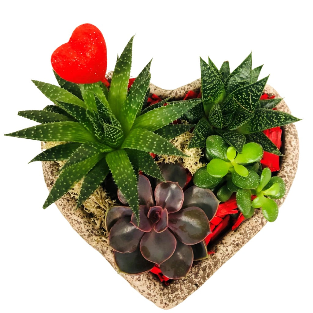 Trendy stone heart shaped planter with a variety of fun & easy to keep succulents.