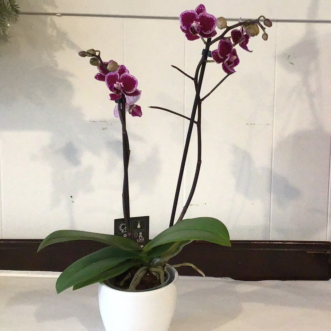 These beautiful orchids are grown right here in Ontario. Using a trendy pot that includes a miniature double spiked orchid, colours may vary.
