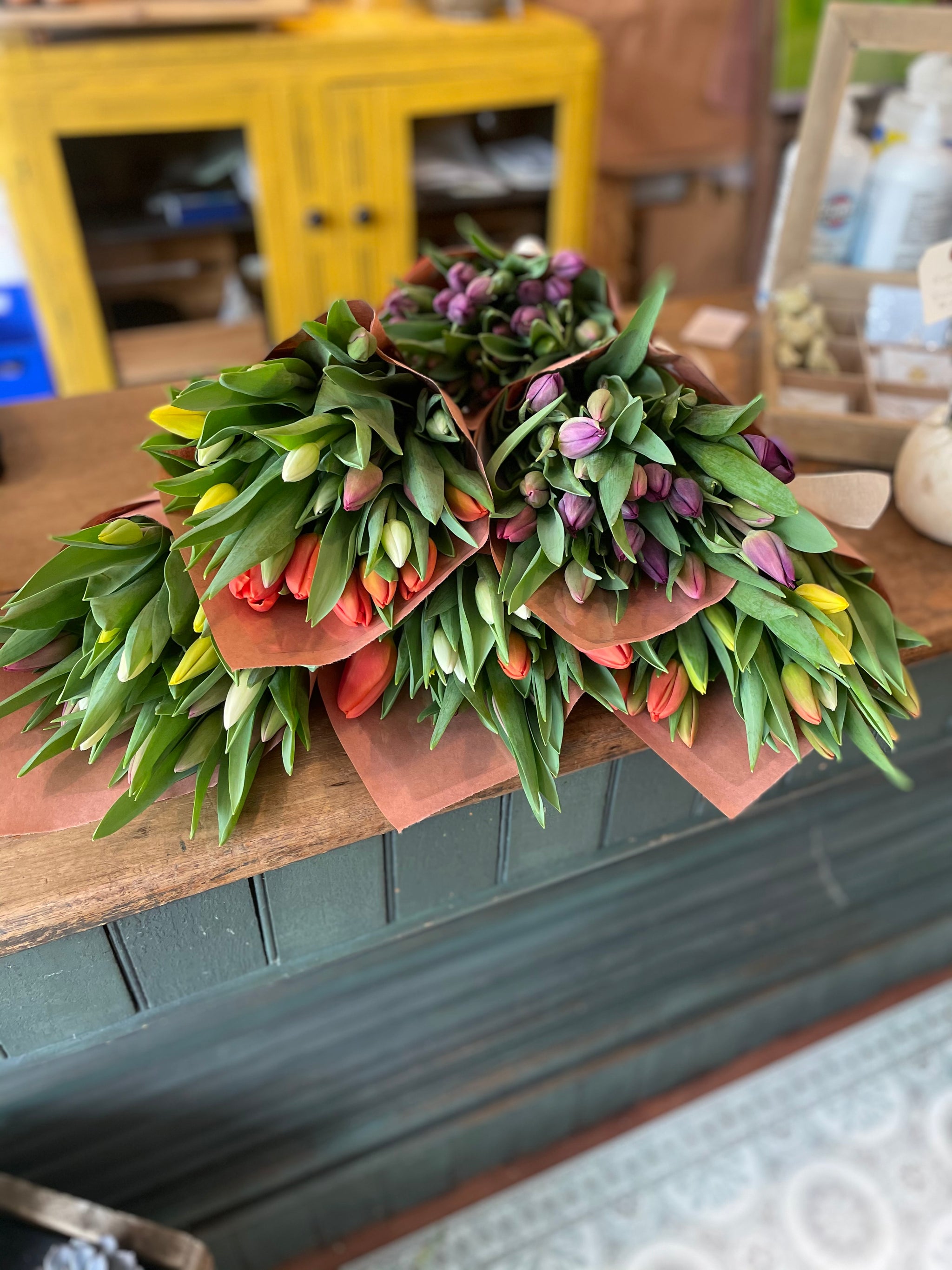 Our Fresh Ontario/PEI Grown Tulip Bouquets are a beautiful reminder of Spring. We will create a pleasant presentation of 1 or 2 bunches of wrapped tulips in cello or paper.