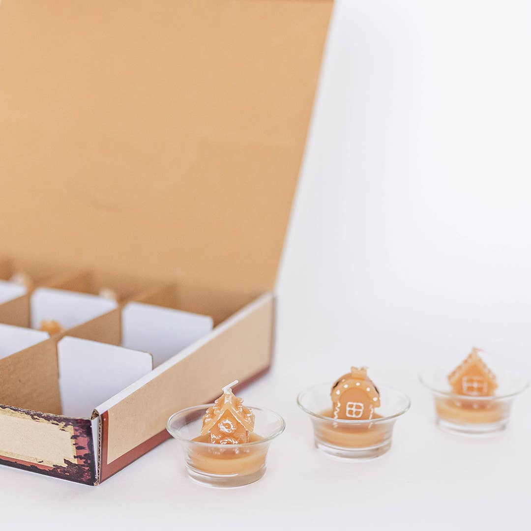 A charming collection of gingerbread house-shaped tealight candles in glass holders.