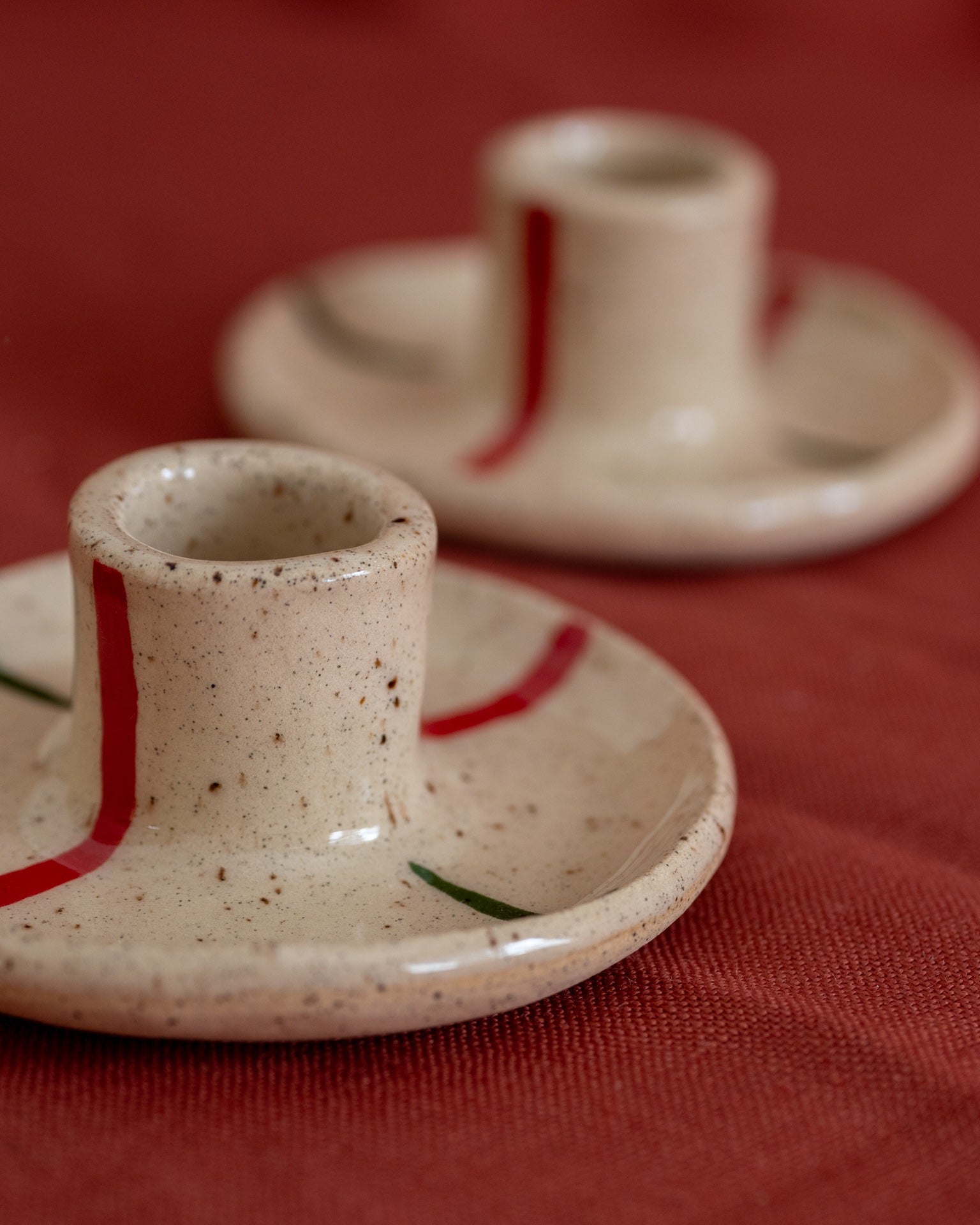 This handmade ceramic candle holder brings a festive, handcrafted touch to your holiday décor. Designed with a wide, stable base and a comfortable grip for easy handling, it fits standard taper candles and adds a warm glow to any table or seasonal display. Crafted from durable stoneware, it’s made to be enjoyed year after year as part of your winter traditions.