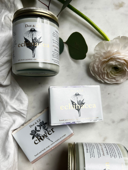 Dot & Lil soaps are finely crafted using a base of plant oils and glycerin and palm oil-free formula. They lather abundantly and last a long time. Each scent is made with a different colorful design, then stamped and wrapped with a patterned label. Echinacea is a notes of sweet flower nectar, geranium, vetiver and dark earth.
