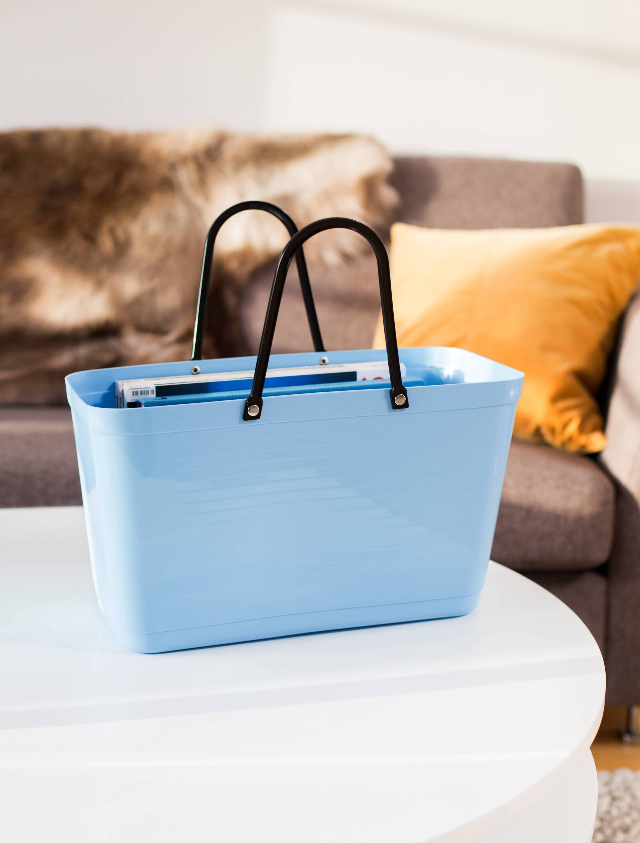 Fashion and function meet effortlessly in hinza's large eco bag in light blue. The classic stylish shape makes it fit in anywhere, while the material allows it to withstand almost anything it is exposed to. This eco-friendly green plastic bag is produced from a renewable raw material sourced from sugar cane. Excellent for storage to keep things organized at home and at the office. The tote bag is an obvious choice for picnics and outings or for pool parties and shopping trips. Completely recyclable!