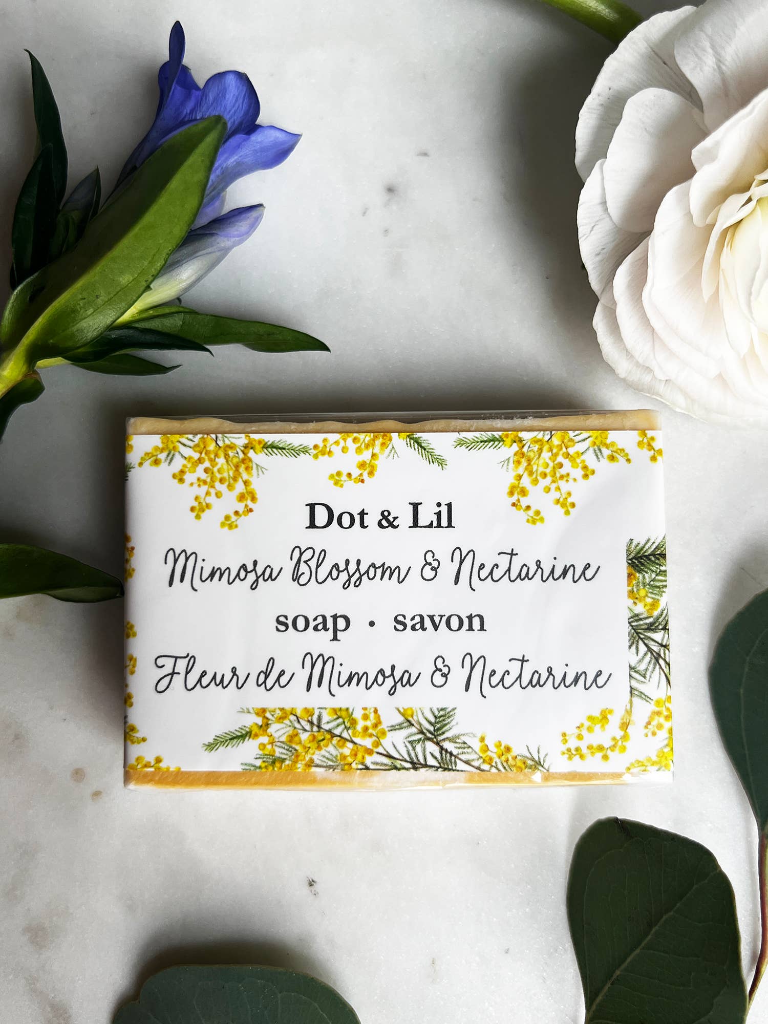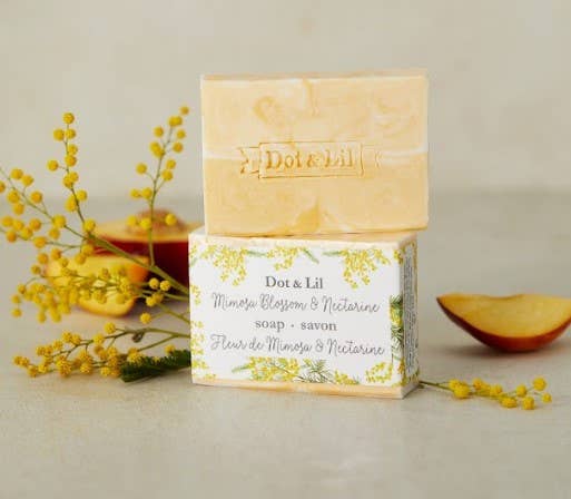 Dot & Lil soaps are finely crafted using a base of plant oils and glycerin and palm oil-free formula. They lather abundantly and last a long time. Each scent is made with a different colorful design, then stamped and wrapped with a patterned label.