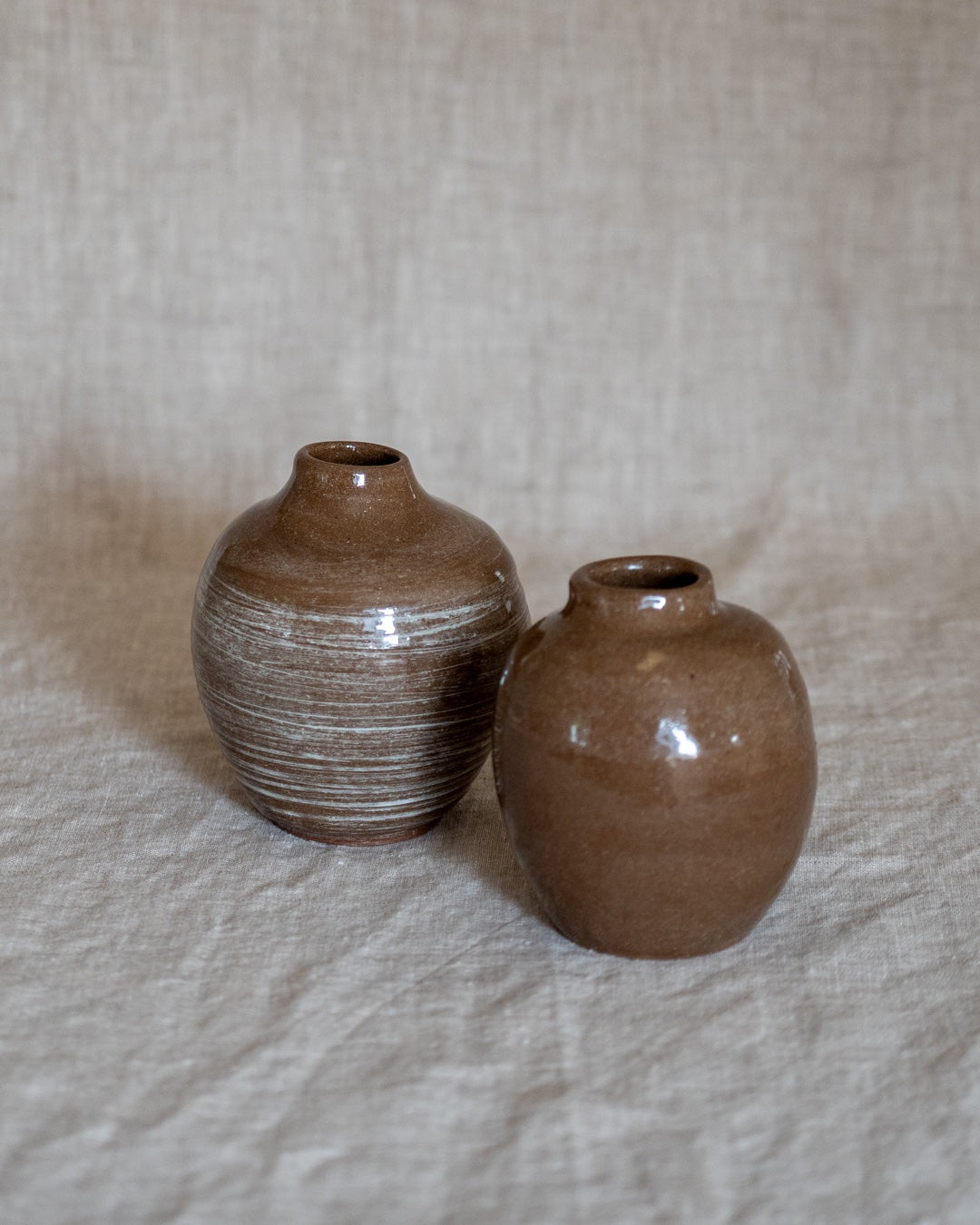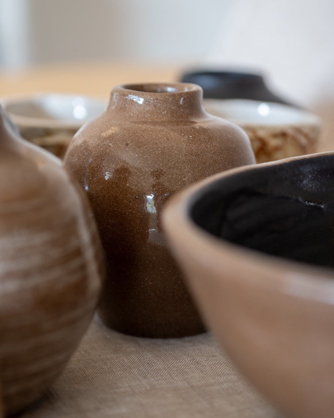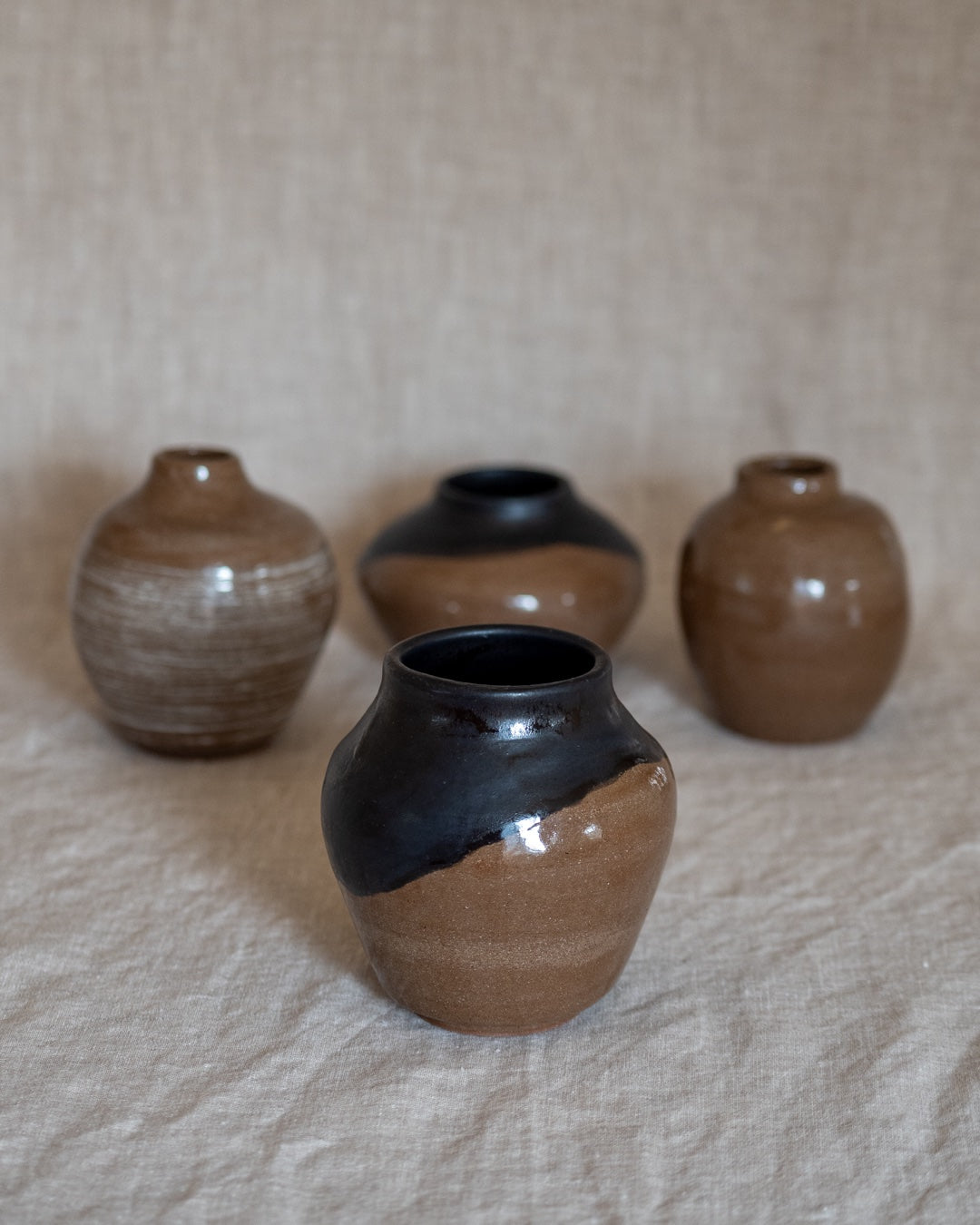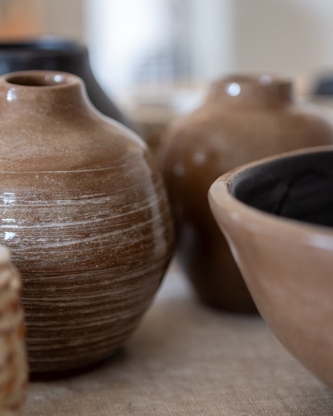 These handmade vases feature organic, softly rounded forms and a warm, earthy glaze that reflects the beauty of artisan work. Created by a local artist, each piece is unique, with subtle variations in color and texture that showcase its handmade nature. The blend of natural brown tones and deep black accents adds a touch of modern rustic charm, making them versatile enough to suit both contemporary and traditional interiors.