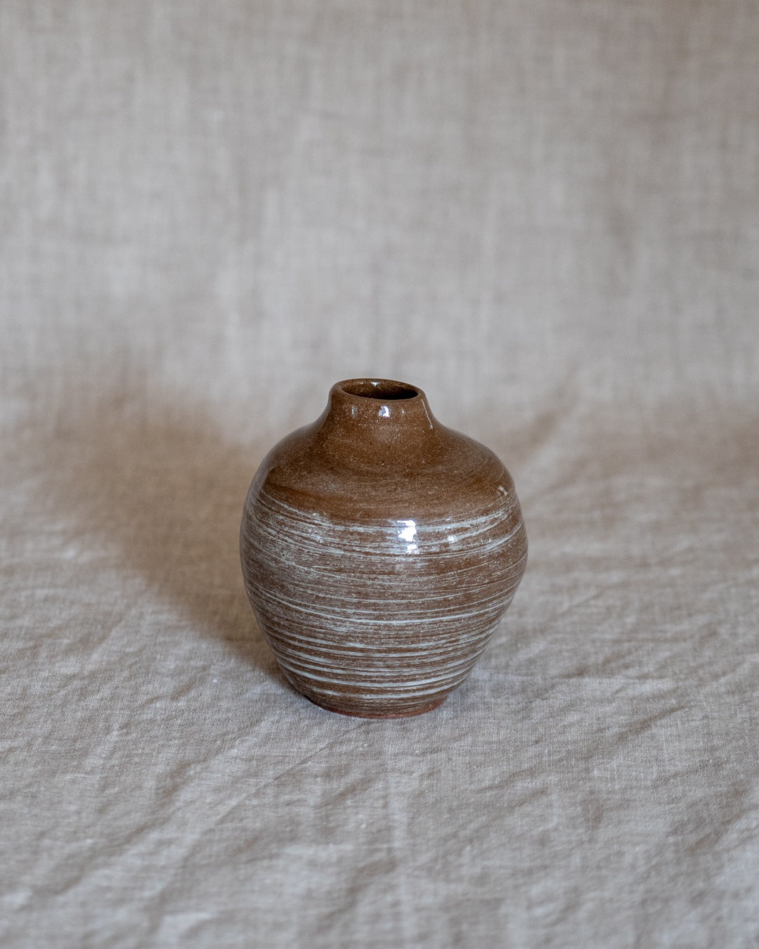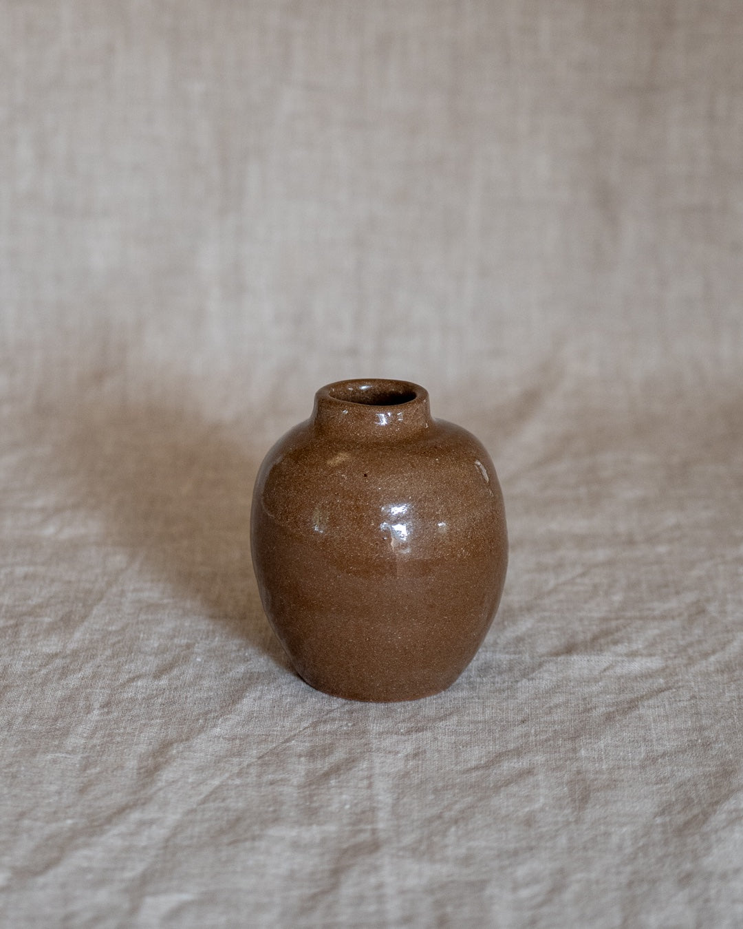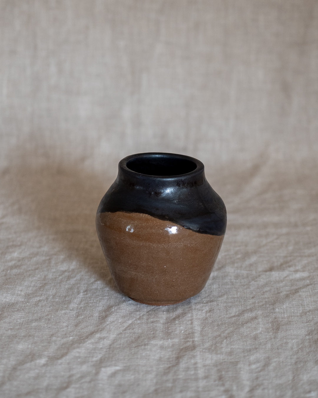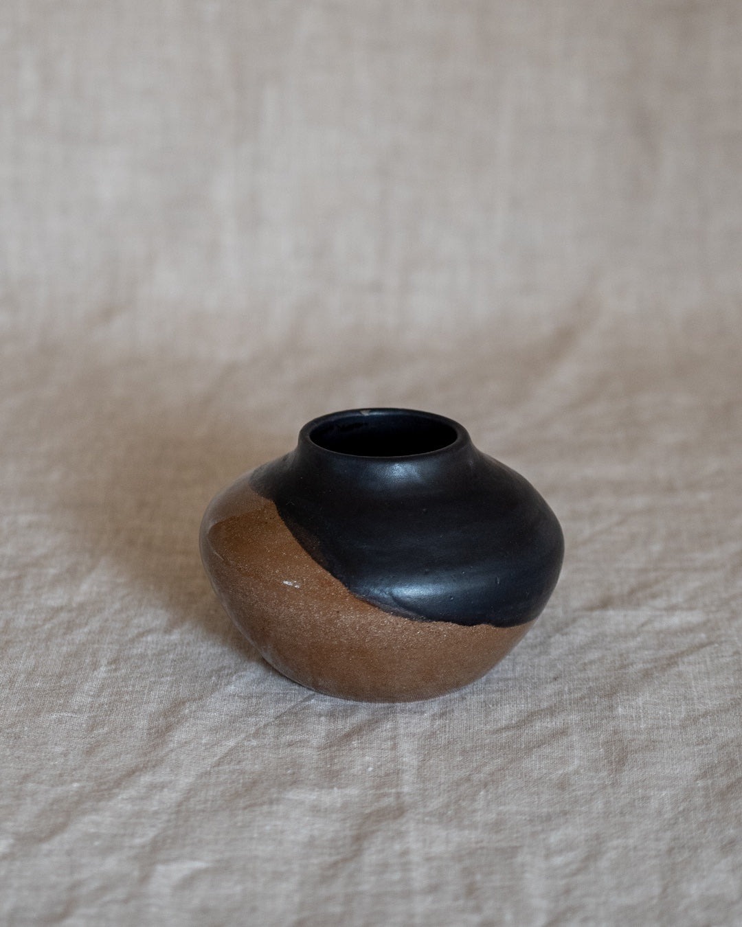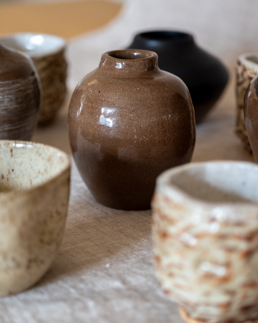 These handmade vases feature organic, softly rounded forms and a warm, earthy glaze that reflects the beauty of artisan work. Created by a local artist, each piece is unique, with subtle variations in color and texture that showcase its handmade nature. The blend of natural brown tones and deep black accents adds a touch of modern rustic charm, making them versatile enough to suit both contemporary and traditional interiors.