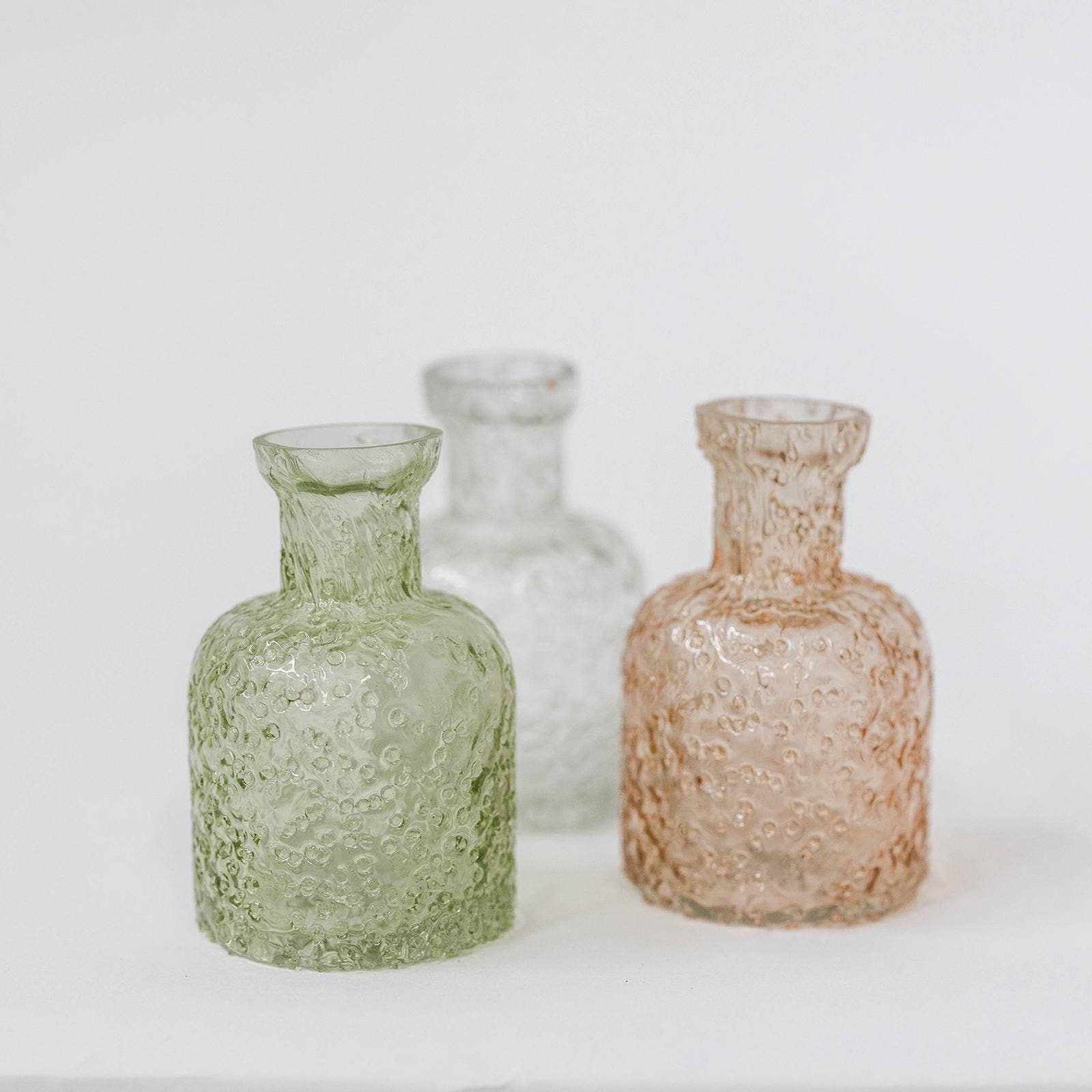 Translucent glass bottle, textured to touch, with bubble design. Classic Home style. Dimensions - 2.25 × 2.25 × 3.75 in
